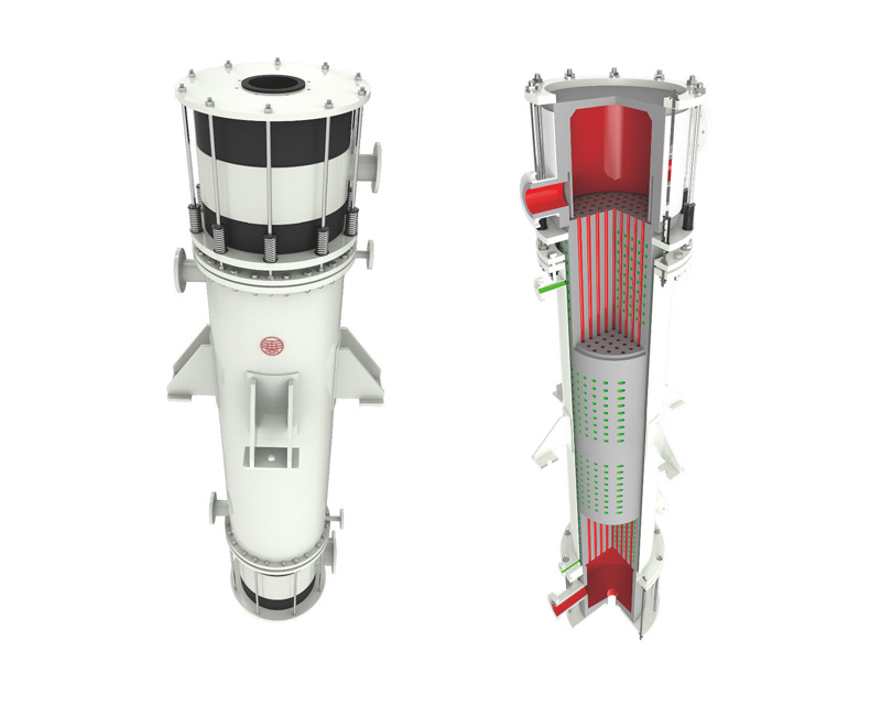 該產品主要由石墨換熱塊、封頭及殼體等組成,采用聚四氟乙烯密封,加裝壓力彈簧作熱脹冷縮自動補償裝置。石墨塊上鉆有兩組不相通的流道,不同流體通過這兩組流道達到熱交換的目的。該產品根據不同的介質可采用四氟乳液、酚醛、環氧、呋喃樹脂等浸漬劑,能滿足酸、堿及有機溶劑等工況的使用要求,并具有傳熱效率高、抗沖擊能力強、性能穩定和檢修方便等優點,是目前應用于蒸發、加熱、冷卻及冷凝等裝置的理想設備。