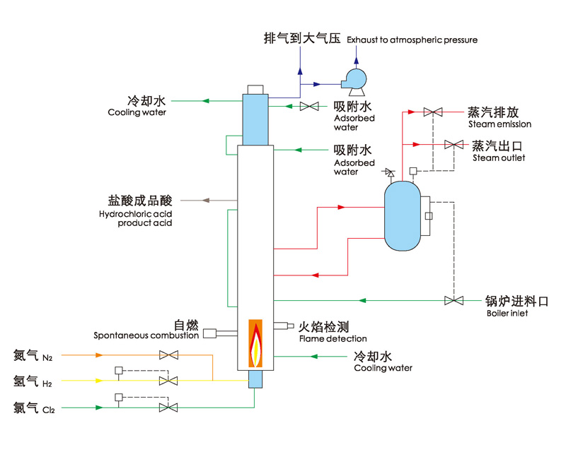 相比較三合一合成爐更具有空間優勢,一般適用于小于250MTPD鹽酸的場合。