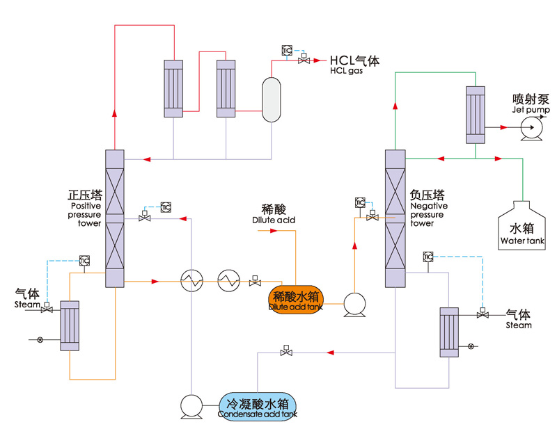 該系統(tǒng)適用于任意濃度鹽酸,通過(guò)在酸中加入萃取劑CaCL2,打破化學(xué)平衡,萃取精餾出HCL氣體,被稀釋后的CaCL2進(jìn)入濃縮系統(tǒng)后再次利用。